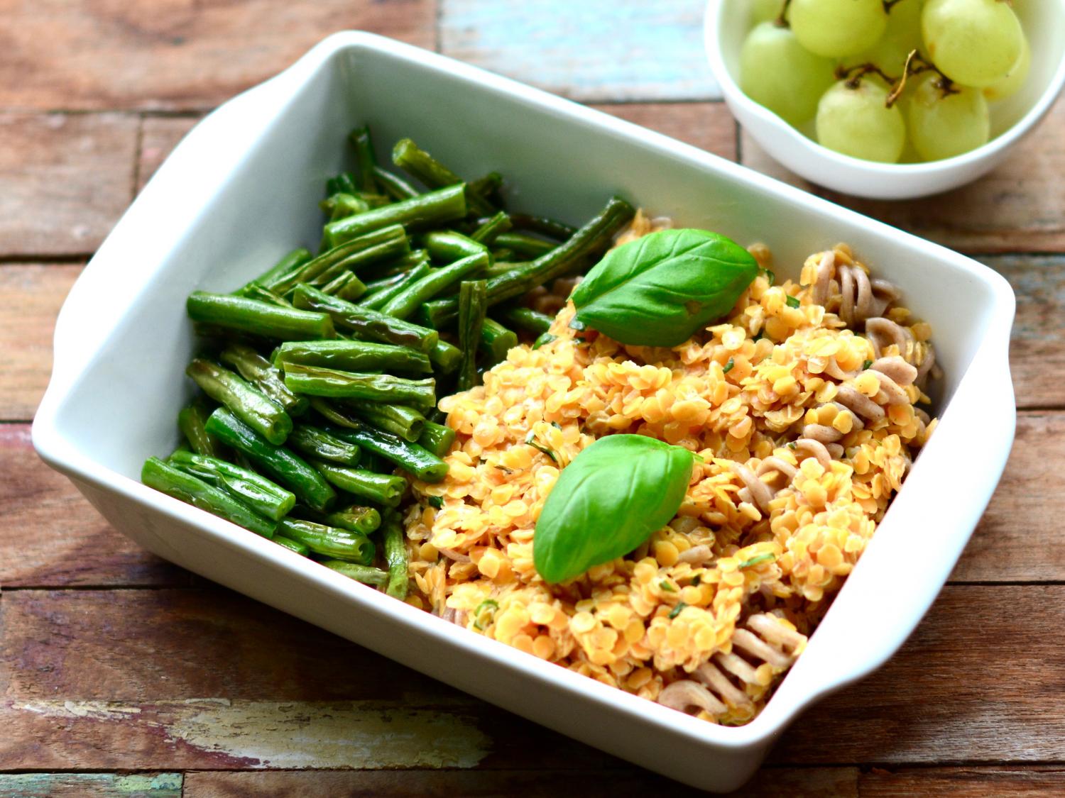 Červenú šošovicu dájte variť s 1,5 násobnom množstve jemne osolenej vody. Ak máte polenú, stačí variť 6 min. Ak máte celú, varte 12-15 min. Cestoviny uvarte do mäkka (špirálky trvajú 6 min.). Na panvicu dajte fazuľové lusky, pridajte trochu vody a soli a pod pokrievkou poduste 10 min. Keď je šošovica uvarená, vylejte prebytočnú vodu, pridajte 1PL sójovej smotany, kari korenie, nakrájanú bazalku a premiešajte aj s cestovinami. Servírujte s fazuľovými luskami.