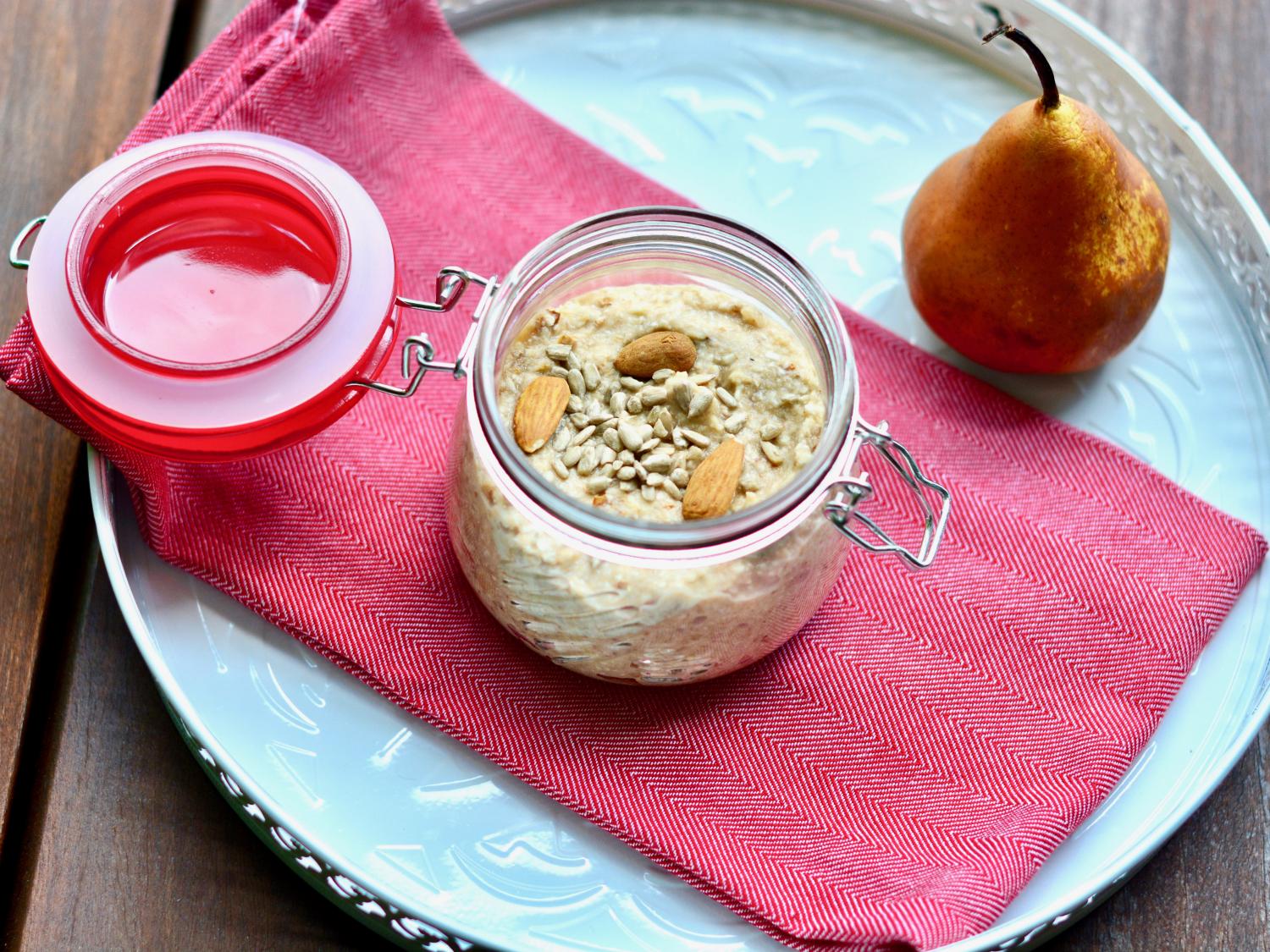 Mandle a slnečnicové semienka namočíme na pár hodín do vody. Hrušku očistíme, pokrájame a podusíme v hrnci 5 min. Do hrnca s varenou hruškou dáme vločky, mandle zo semienkami a ponorným mixérom vytvoríme kašu. Konzumujeme buď hneď teplé, alebo odložíme do pohára do chladničky.