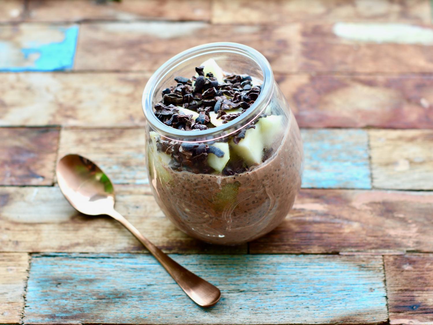 Večer si zmiešame mlieko, smotanu, kakaový prášok a sezam. Hrušku nakrájame na kocky a dusíme 6-8 min. pod pokrievkou, pustí sladkú šťavu a ak nie sme naučení na príliš sladké chute, bude nám stačiť na osladenie pudingu. Z hrušky môžeme ponorným mixérom urobiť pyré. Podávame spolu posypané drvenými kakaovými bôbami.