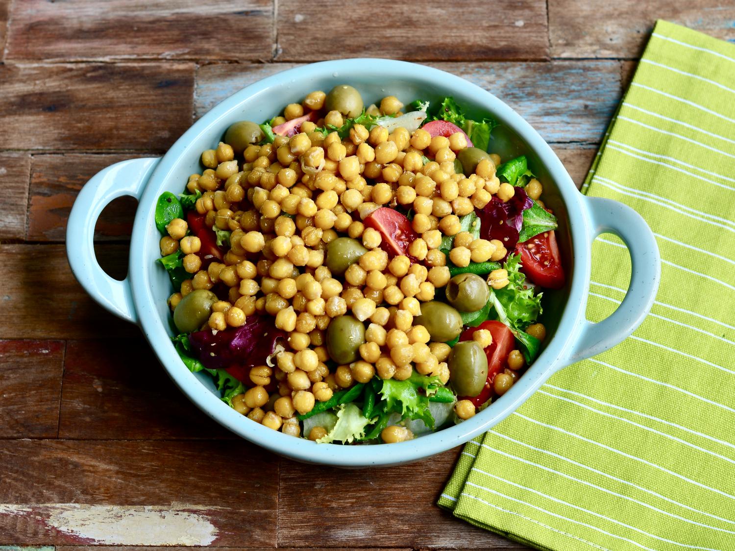 Šalát umyjeme a vysušíme. Do šaláta vmiešame olivový olej, celozrnnú horčiu, soľ a korenie. Preložíme do taniera, na vrch poukladáme nakrájané rajčiny, olivy a uvarený cícer (varíme v jemne osolenej vode do mäkka alebo kúpime varený).