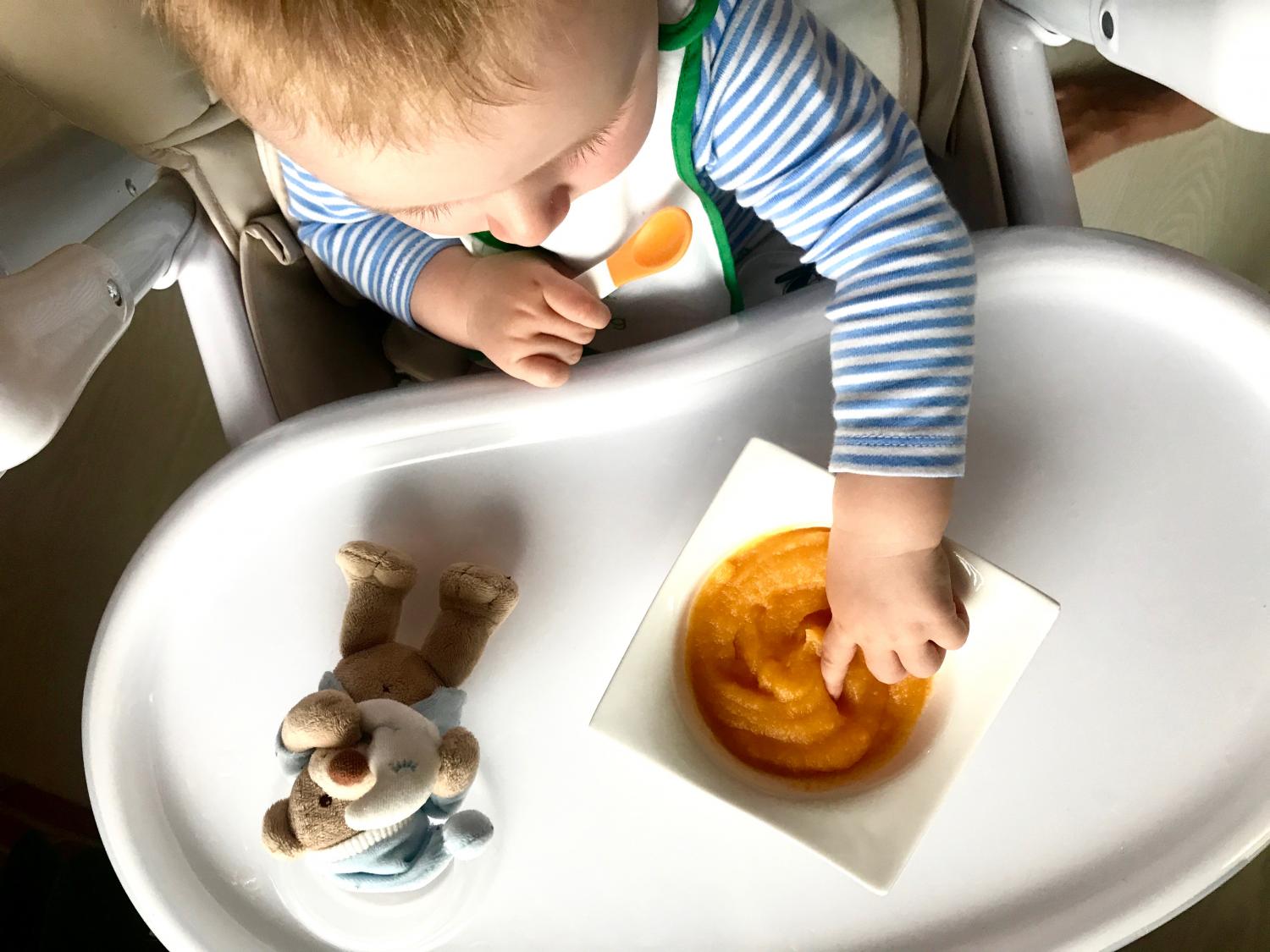 Najvhodnejšia je mrkva, zemiak, sladký zemiak. Uvaríme malé množstvo z jedného druhu zeleniny, rozmixujeme na hladkú kašu a ponúkneme dieťatku 1-2 lyžičky.