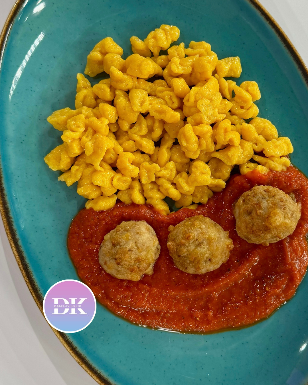 Toto je jedlo, ktoré poteší celú rodinu. Jemné mäsové guľky dopĺňa sladkastá zeleninová omáčka a k tomu farebné mrkvové halušky. Jedlo spĺňa zásady vyváženosti, obsahuje plnohodnotné bielkoviny, zeleninu aj kvalitné sacharidy. Výživné, hravé a pritom ľahko stráviteľné – ideálne pre deti aj dospelých.