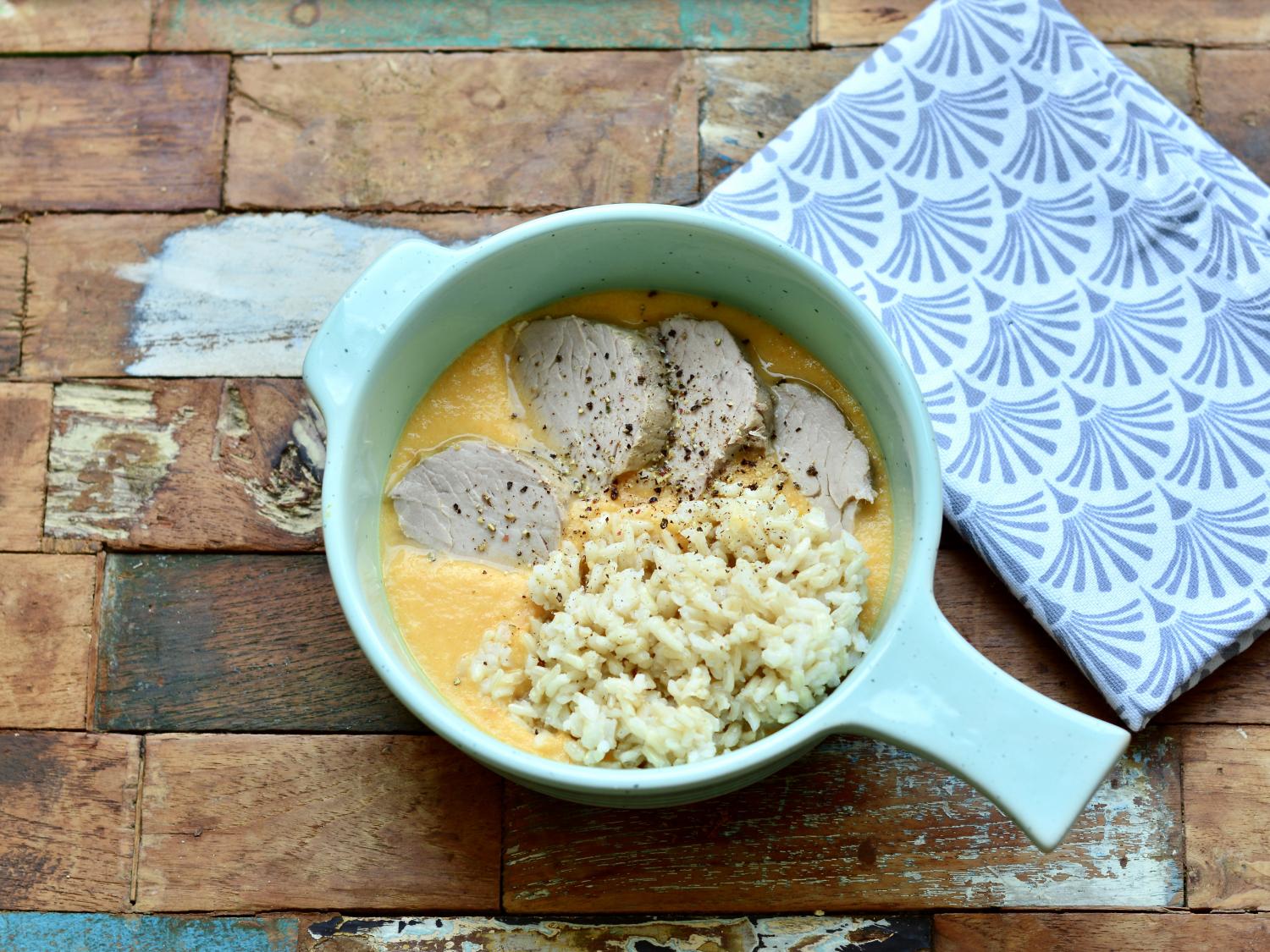 Do vody so zeleninou pridáme soľ, 3 PL sójovej smotany a šťavu z ½ citróna. Tyčovým mixérom omáčku vymixujeme na hladký krém. V prípade potreby pridáme odloženú šťavu. Omáčku podávame s plátkami mäsa a poprášené čiernym korením. Ja som ako prílohu použila varenú ryžu natural.