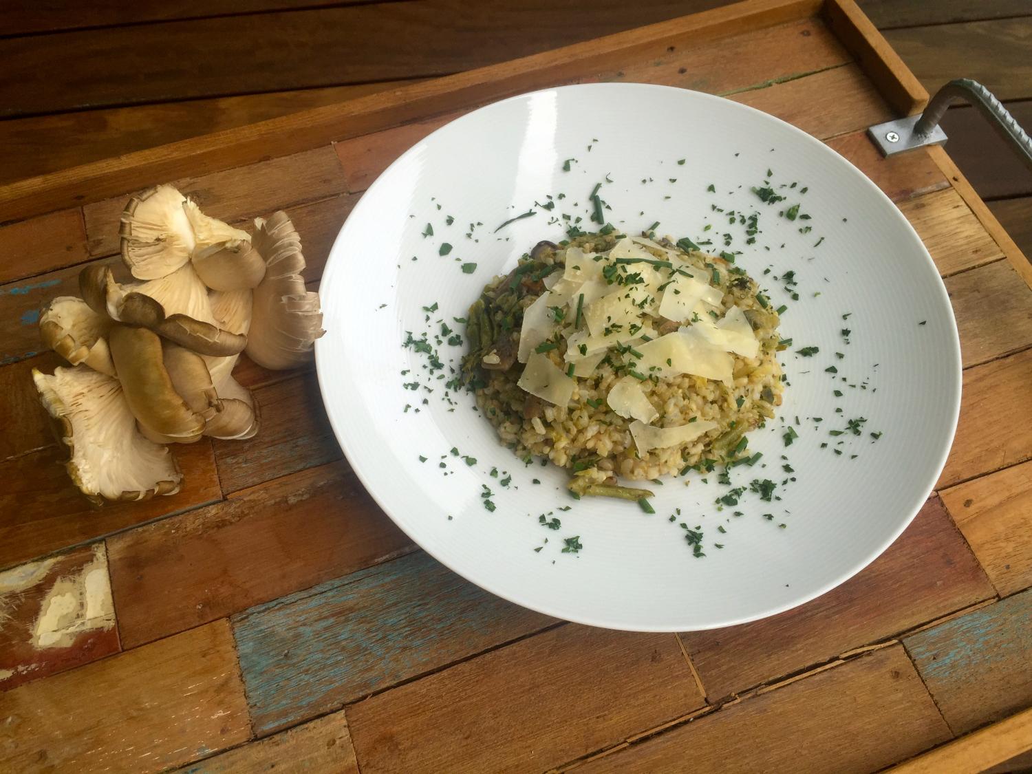 Zoberieme panvicu a na olivovom oleji opražíme nakrájanú mladú cibuľku. Následne pridáme na panvicu najemno nakrájanú hlivu ústricovú, ružičkový kel, brokolicu a mrkvu (môže byť aj postrúhaná). Zeleninu podusíme približne 30 minút tak aby bola chrumkavá, nie rozvarená. Jemne ju posolíme a pridáme pretlačení cesnak. Nakoniec primiešame sójovú smotany a uvarenú ryžu. Všetko spolu premiešame. Na tanieri ozdobíme parmezánom, posekanou pažitkou a petržlenovou vňaťou.