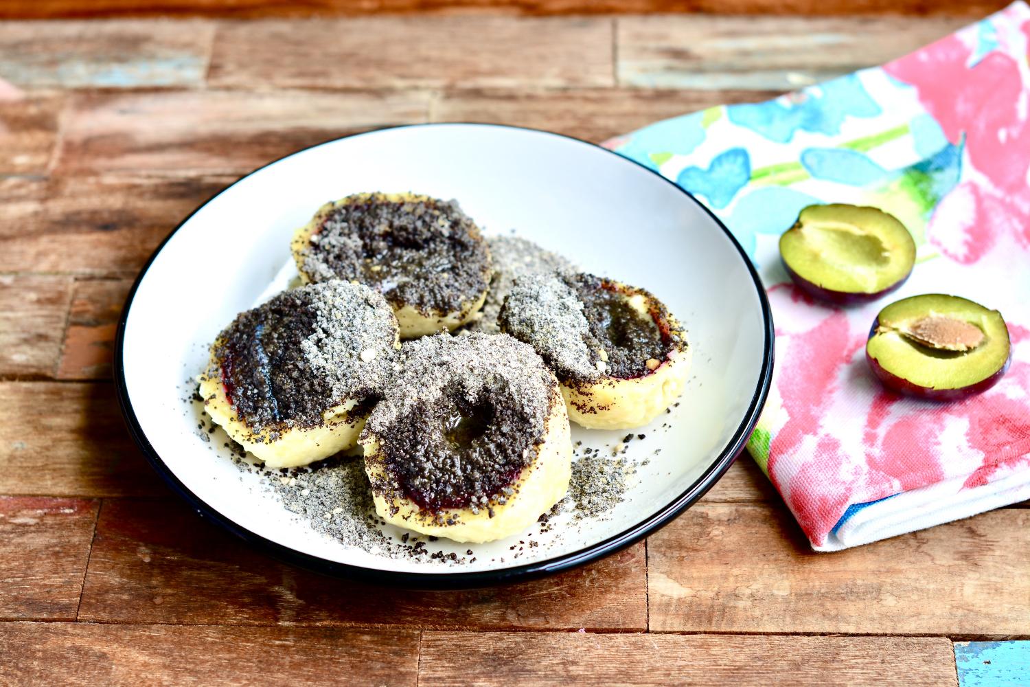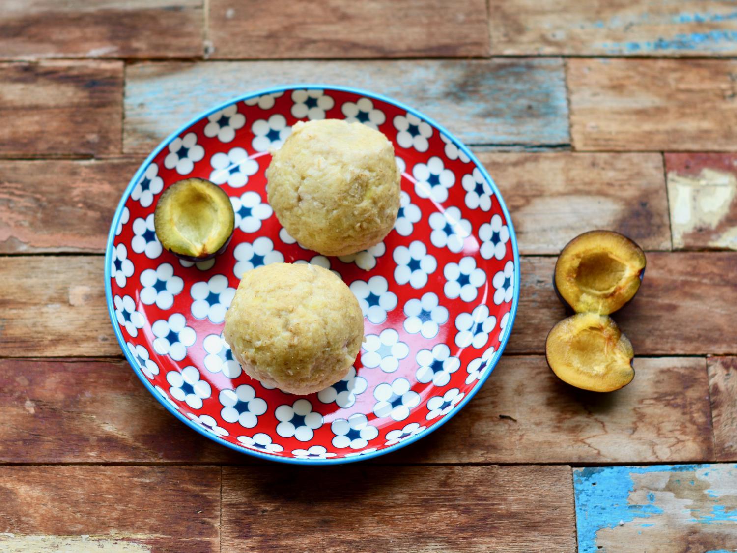 Zemiaky uvaríme v šupke do mäkka (30 min.). Necháme vychladnúť, očistíme a postrúhame. Na pracovnej doske (ja používam silikónovú) zmiešame zemiaky, so štipkou soli, s ovsenou múkou, vajíčkom a rukami vypracujeme lepkavé cesto. Cesto spracujeme do valca (priemer cca 12 cm), ktorý krájame na cca 1-1,5 cm hrubé krúžky. Do každého krúžku v rukách vložíme umytú a odkôstkovanú slivku, zabalíme a vypracujeme guľku, ktorú na doske pomúčime ovsenou múkou. V hrnci necháme zovrieť vodu a do nej po cca 5-6 ks dáme variť hotové gule. Gule sú uvarené, keď vyplávajú na povrch. Vtedy ešte 3-4 min. necháme variť a vyberieme. Podávame s pomletým makom (orechami alebo tvarohom), agávovým sirupom a roztopeným ľanovým maslom. Ak chcete výživnejší variant, orechy môžete nahradiť tvarohom.