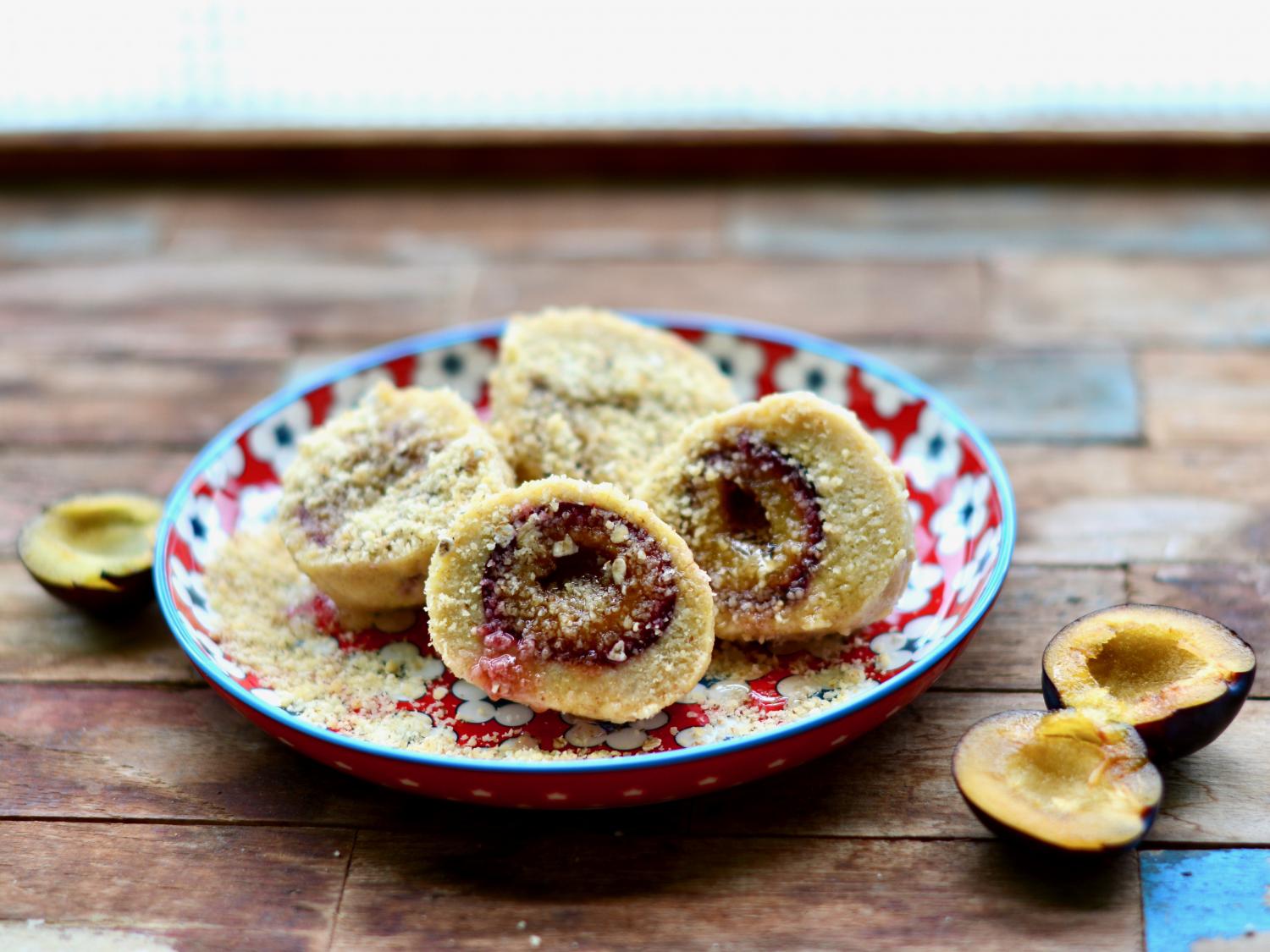 Slivkové gule azda každému patria do zoznamu obľúbených jedál. Ja som sa pohrala so surovinami, zemiaky varené v šupke majú nízku glykemickú záťaž a múku som nahradila pomletými ovsenými vločkami. Ako posýpku som použila mleté orechy s pár kvapkami agávového sirupu a roztopeným ľanovým maslom. Určite to nie je jedlo na každý deň, ale v rámci malého zhrešenia vymením svoju bežnú večeru za takýto zdravší variant ovocných gulí. Prípadne si takéto jedlo môžete dať ako odmenu po túre, behu či náročnom bicyklovaní:)