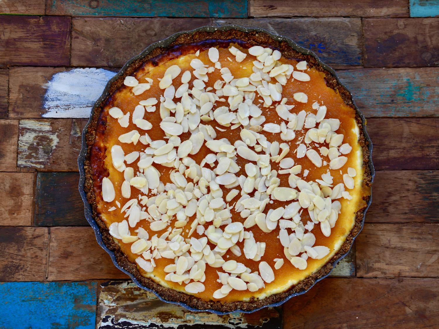 Bezlepkovú granolu pomelieme najemno, zmiešame s roztopeným maslom, rozložíme na spodok vymastenej formy na koláč, vrch dobre utlačíme a pečieme 10 minút vo vyhriatej rúre na 180 C. Vytiahneme a chvíľku necháme vychladnúť. Tvaroh zmiešame s vajíčkami, trstinovým cukrom alebo medom, vanilkou a vylejeme ho na cesto. Pečieme 25-30 minút na 180 C pokiaľ vrch nechytí zlatú farbu, vyberieme a necháme dobre vychladnúť. Sušené marhule dáme do malého hrnca s 1 dcl vody a 10 minút dusíme na miernom ohni, pomixujeme na hustý džem (ponorným mixérom). Džemom potrieme koláč a posypeme mandľovými lupienkami.