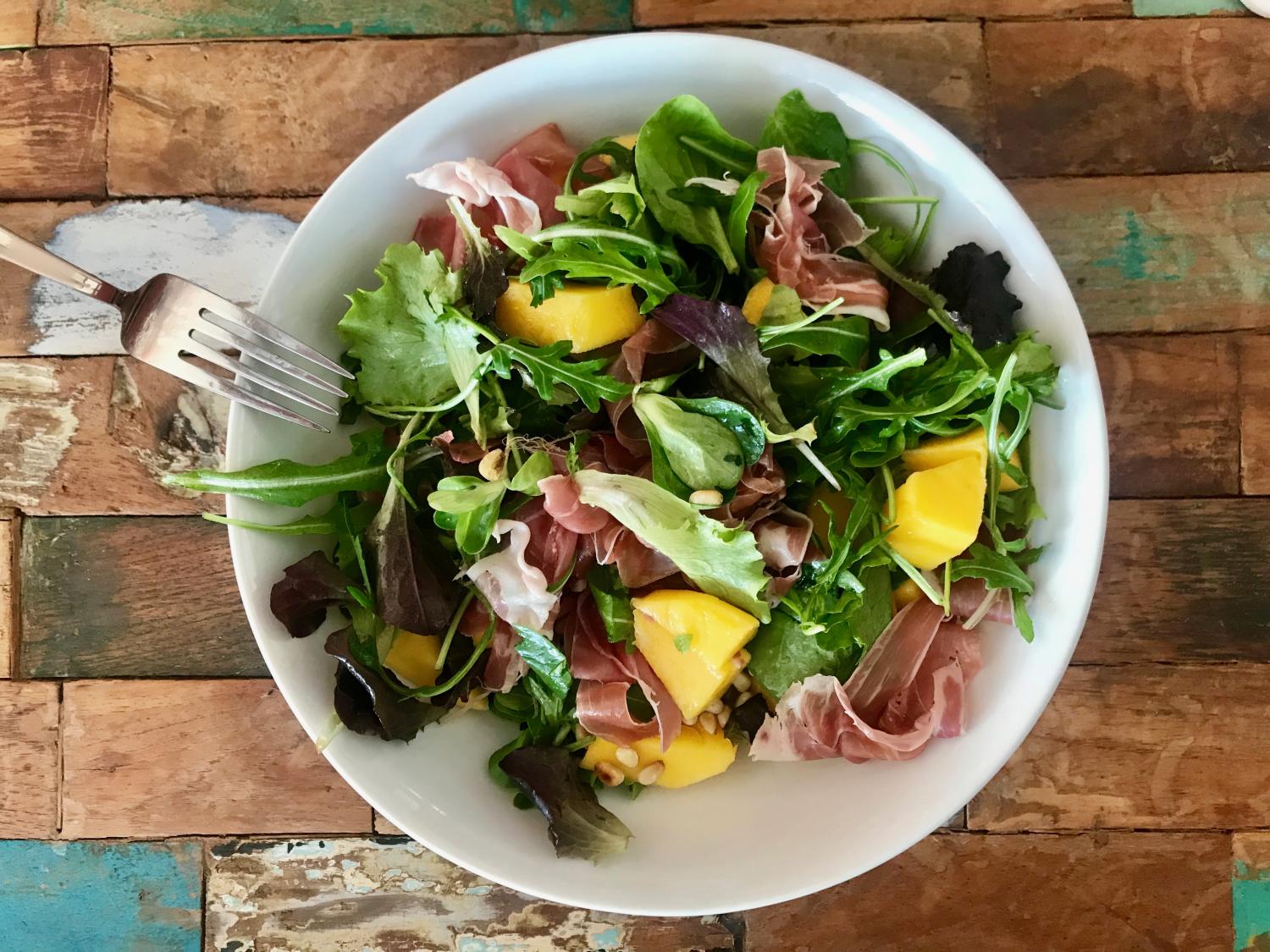 Šalát umyjeme a vysušíme. Mango očistíme a nakrájame na kocky. Píniové oriešky jemne opečieme na suchej panvici. Všetky suroviny zmiešme, ochutíme citrónovou šťavou a ľanovým olejom. Na hotový šalát poukladáme natrhané prosciutto.